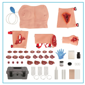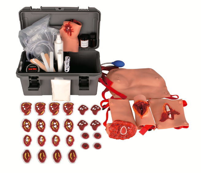 El kit avanzado de simulación de heridas proporciona más de 30 heridas traumáticas hiperrealistas, incluyendo lesiones por arma de fuego, laceraciones, fracturas y amputaciones, diseñado para entrenamiento práctico en situaciones de múltiples víctimas y medicina en el campo de batalla. Con diseños adhesivos y portables, además de un sistema completo de sangrado simulado, este kit permite realizar triage realista, vendajes y ejercicios de control de hemorragias para técnicos de emergencias, médicos y equipos de respuesta a desastres